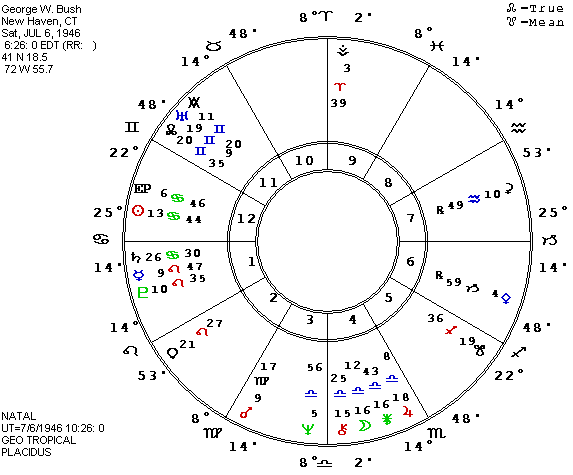 Most readers will already have Bushs chart, and will be aware that in April-May of 2003 to 2005 his P Sun will conjunct his N Mars and trioctile his N MC in Aries. Those two years are a prime time for him to be at war, though he has continuing aspects for aggression and violence for several additional years. Obviously, many different events are possible, in addition to attacking Iraq. Periodic terrorism in the US is possible for years to come. Personal attacks on Bush are also possible. There is likely to be increasing internal unrest in the US over the policies and power of our government. As ancient astrologers noted, Libra can be manifested in partnerships and cooperation, or in competition and warfare. Juno carries the meaning of Pluto/Scorpio that, like Libra and Venus, describes the challenge of learning to share the world with lasting, equalitarian relationships. So Juno also can cooperate and share resources and power for mutual pleasure, or it can signify personal gratification at the expanse of others: theft, rape, and death. Bushs P Mars spends the next few years progressing over his Chiron (ethical and legal issues), his Moon (our homeland and people), Juno, and a bit later, Jupiter (beliefs, values, and ethics) and his IC in Washington DC.
