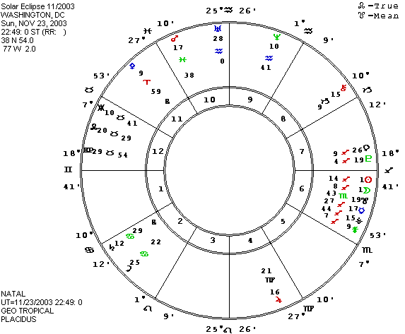 Solar and lunar eclipses have been used as keys to the future for thousands of years. Though some students suggest that relevant world events may occur prior to the eclipse, most experts believe that the patterns in an eclipse horoscope describe the following months or years. One tradition says that a lunar eclipse provides information about the following three months, while a solar eclipse may be relevant for the following three years. Another tradition suggests that any eclipse only remains relevant until the next one of the same type, either lunar or solar. The solar eclipse on May 31, 2003 has an emphasis on fixed and mutable signs and houses, with a strong air emphasis, especially when it is calculated for Washington DC. The rising Mars and East Point square the MC axis, all in fixed signs, do fit a power struggle, but the signs are air and water, symbolizing the conscious and subconscious sides of the mind, and the aspects are not exact to the degree. The eclipse is in Gemini in the 4th house, along with Ceres, with wide trines to the 1st house planets and Ascendant in Aquarius. Uranus, an air planet, is also in the 1st house with the Antivertex in Pisces, and they are widely square the nodes, MC axis, and Ceres. The squares show conflict between the actions of the subject signified by the 1st house, in this case the US in Washington, and the homeland and public in the 4th house. We have had peace marches and rallies in several regions of the US, and I expect them to increase. But my guess is that during the winter of 2002-3, the conflict will remain on the mental level, talking and writing: arguments about the situation in Iraq and threats by Bush and his hawks. The inspectors may go on inspecting for many weeks while Saddam cooperates outwardly and tries to keep his weapons hidden.