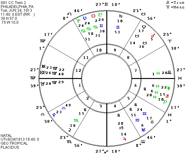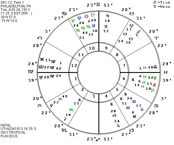 One pair of readers responded to the double challenge, and they were right on the female twins but guessed wrong on the male twins. They seem to be using a different dwad system than the one I prefer. There are several in existence, but the one that has worked best for me starts every sign with its own dwad so the first 2 1/2 degrees of each sign is the “pure” quality of that sign. Using that dwad system, the first female twin has the Taurus dwad rising and the second has the Cancer dwad rising. In general, Taurus suggests solid physical endurance in contrast to the potential helplessness of the baby side of Cancer. Of course, if the individual survives, she can move into the mother side of Cancer. The MC dwads of Aquarius and Aries respectively, do not offer much help, nor do the East Point dwads of Aries and Gemini. The first-born has the Antivertex in Capricorn, more closely conjunct Jupiter than is the Aquarian Antivertex of the second-born. But, the first-born also has a closer opposition to Pluto in the 8th house, and Capricorn is often found with health problems in the early life which may clear when the person finds strength through successful work. So on balance, the rest of the dwads are not helpful or even misleading in this case.