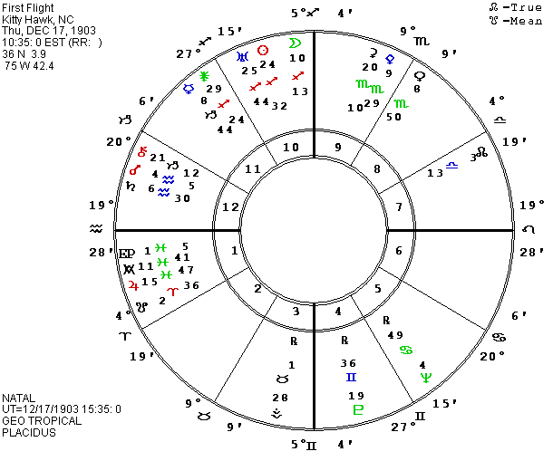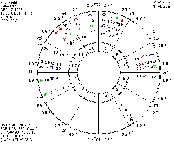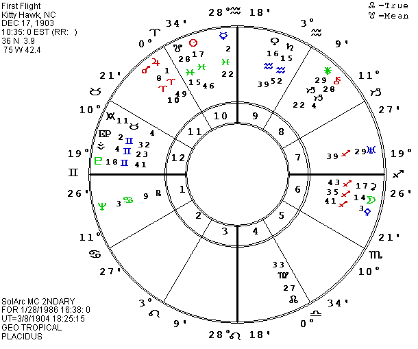 Meanwhile: At the UAC conference (which was lively and in a very pleasant setting except for the unfortunate speakers assigned to tents), Rick Ostrander gave me the data for the first flight of a “heavier than air” craft by the Wright brothers in 1903 in N.C. I am including a copy of the chart, with local houses added for Cape Canaveral, FL. As readers know, anything that has a beginning has a horoscope. Though this first flight was only in the air for some 20 seconds, and only achieved about 5 feet above the ground, (if my memory is accurate), it still marks a historic first and should give us clues to the future potentials for human flight. Our venture into deep space, above our atmosphere, is an extension of our early flights, and theoretically can still use the same initial horoscope. Based on that theory, I calculated the chart’s local houses for Cape Canaveral, and progressed it to the date of the Challenger explosion. And, of course, I ran all the asteroids.