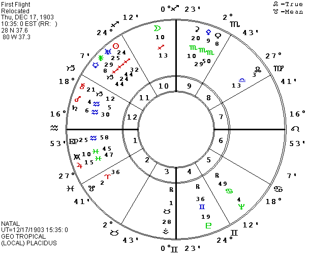 The initial horoscope is impressively just what astrologers would expect. Aquarius is rising, the sign of new technology, especially connected to air. Uranus, the Ascendant ruler, conjuncts the Sun in the tenth house in Sagittarius, indicating the publicity (Sun) and destiny of travel to far away places as well as the new knowledge involved. Jupiter, ruler of Sagittarius, is in the first house of personal action, conjunct the Antivertex (auxiliary Ascendant). The asteroid “Karl Marx” is also in the first house conjunct “Pittsburghia” (similar to Pluto with its potential for power struggles) and the local (Canaveral) Antivertex, all at ten degrees of Pisces square the natal Moon at ten Sagittarius in the tenth house. Pluto is exactly trine the Ascendant and Urania completes an exact grand trine in air signs. Mars (personal power and action) conjuncts Saturn (executive power and law) in Aquarius (new knowledge) in the twelfth house (faith and ethics based on faith) and is quincunx Neptune (faith-ethics again) in Cancer (the earth and the public) in the fifth house (expanding power). A yod is filled in by the natal Canaveral Part of Death in Sagittarius, which is exactly on the natal MC in North Carolina.