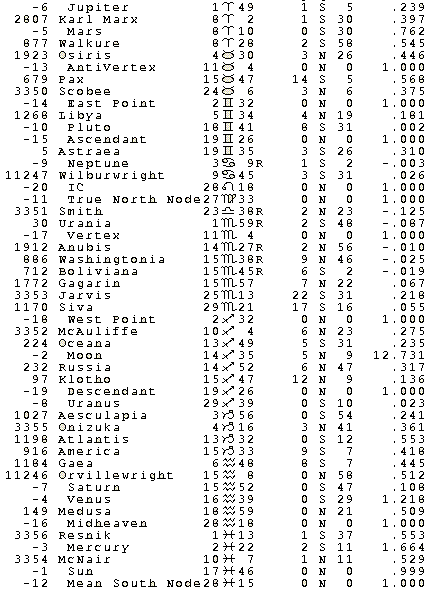 Before checking, which asteroids would we expect to be prominent in the chart? Atlantis, of course, for modern technology and its potential for abuse. Some of the asteroids named for Russian people, states, etc. since Russia put up the first satellite and is currently working in a space station while we are grounded. The seven asteroids named for the seven astronauts who were killed in the Challenger explosion. Some of the ones named for adventurers, or associated with fame and/or death to be activated by progressions. Those named for our own country such as America and Washingtonia. Urania (if it is like Uranus, associated with new knowledge and explosions), etc.