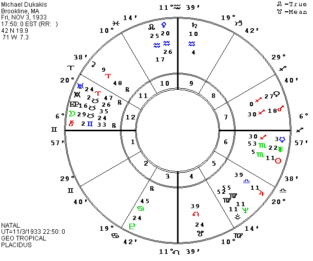 The six P.M. time we had been previously given for Dukakis gave him the same pattern, which is also shared by Walter Mondale and Jesse Helms; one liberal Democrat and one conservative Republican. However, the latest information which I have thanks to Frances McEvoy is that Dukakis was actually born at 5:50 P.M. He says that he was born at 6:50 A.M. His mother says she thinks about 6 P.M. Hospital personnel told Frances on the phone that he was born at 5:50 P.M. so Dukakis’ memory that he was born ten minutes before the hour just has to be combined with his mother’s approximate hour.
