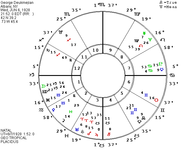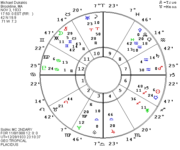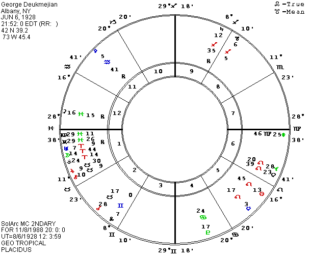 One of the men mentioned as a possible choice for Vice Presidential candidate on the Republican side is our California governor, George Deukmejian. He is said to be reluctant since he would be replaced by a Democratic governor, but his ethnic background would counterbalance that possible asset of Dukakis and he would probably win California for the Republicans. We published his horoscope a couple of years ago, so I re-ran it for the fall election, and it strongly suggests both his possible choice for V.P. and a possible win. His P Sun is currently conjunct his P Halley and P Aten (a Sun god), while P Atlantis is conjunct his natal Sun. P MC in New Orleans is conjunct P Saturn and trine Halley. Transiting Halley will be conjunct his natal America on Election Day. P Hybris (hubris or overreach) arrives at his natal MC just before the election date. He has P Moon conjunct P Washingtonia and P Utopia, just ending a trine to P Sun but starting a trine to Saturn. P Moon trines P Saturn for the Republican convention this month. P MC and five progressed asteroids are on his Ascendant in New Orleans, site of the Republican nominations: Dudu, Bacchus, Kleopatra, Lachesis, and Abundantia, with the collection sextile his MC in Washington, DC and trine his P Neptune. Dudu seems Plutonian, Bacchus seems Neptunian, Lachesis is one of the Fates, Kleopatra was a ruler, and he might have all of these in abundance along with a new executive position (MC).