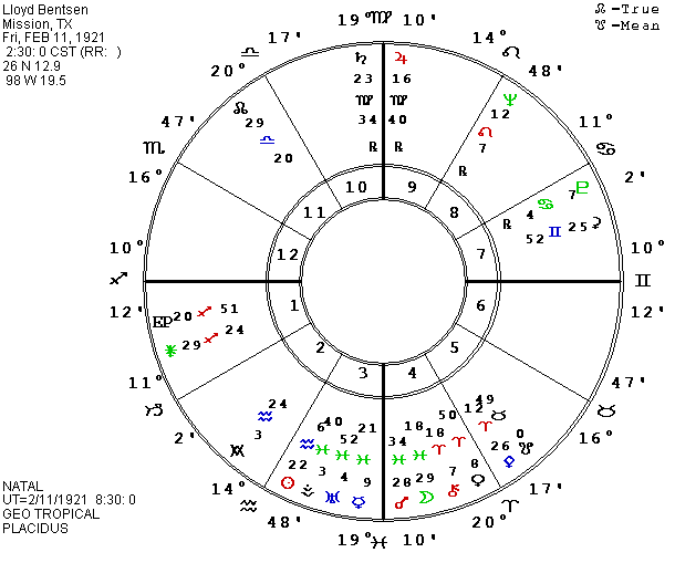 Lloyd Bentsen has been selected as the Vice Presidential candidate on the Democratic side, and his data is given in the Gauquelin book of American charts. He was born on February 11, 1921, at 2:30 A.M. in Mission, TX. The most dramatic feature in his chart is Progressed (P) Saturn on his MC for years.