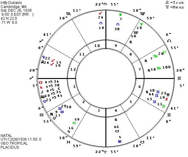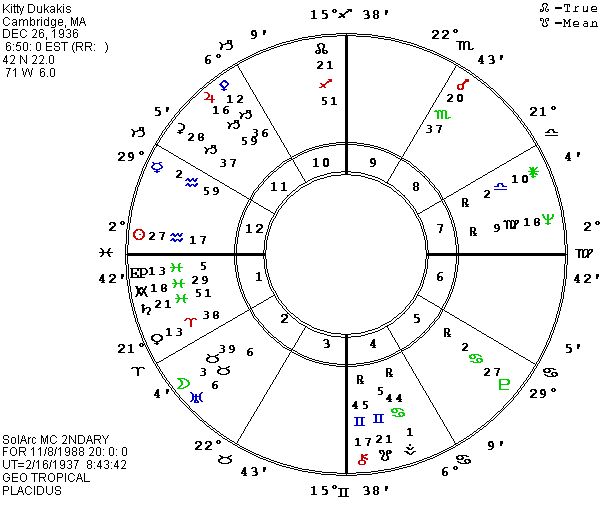 Returning to astrology, guessing details is still a risky game. Astrologers guess wrong on elections quite often. As has been said often in the past, stress aspects could mean failing to win the election or they could mean winning and having a very tough time in the job. We have one more treasure from Frances McEvoy which might help our attempt to guess the outcome of the election this fall: the birth data of Kitty Dukakis, Michael’s wife. She was born on December 26, 1936, at 6:50 A.M. in Cambridge, MA. The chart shows idealism and intelligence with Sagittarius rising, Jupiter conjunct the Sun in the first house along with Ceres, and Mercury also in the first house conjunct the East Point. Pallas conjunct the north node of the Moon in Sagittarius and Moon, Chiron, and south node in Gemini add to the tendency to be intellectually curious and verbally fluent. Strength is shown by the five first house factors being placed in Capricorn, and by Mars in the tenth house, producing a major one-ten theme in the chart. The confrontation between letter one (self-will in action) and letter ten (the limits of self-will) can mark a “steam roller” with enormous ambition, or a major danger of self-blocking. Her current life points to a mixture of the two. She is campaigning to become First Lady in what is still the most powerful country in the world and she recently had surgery for a problem with one or more vertebras in her neck. The bony structure of the body is connected to Saturn while Mars is a key to the muscles which hold the bones in place. Problems in that area are typically associated with unconscious tension over the handling of power. We may be afraid of failing to handle our power and responsibilities, in which case illness will excuse us, get our conscience off our backs. Or we may feel blocked or oppressed by the power of the world. In the latter case, illness will again free us from some of the demands. Saturn illnesses may be as simple as a need for more time and we have to learn to delegate or to leave some things undone or not done well.