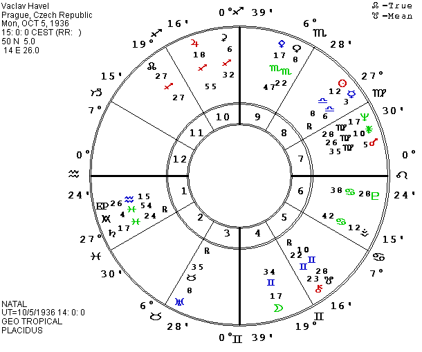 I calculated Havel’s horoscope for Moscow as well as for his birthplace in Prague, since the revolution was only possible because of Gorbachev’s change in the U.S.S.R. It is fascinating that Havel’s P Sun was just entering his tenth house (showing his potential for executive power) when Gorbachev came to power in March 1985. Havel’s P Sun had reached a square to his Moscow Ascendant and his natal Mars (which is on his Descendant in Moscow along with Bohemia, a geographic region within the country) when he became President of Czechoslovakia. That local Ascendant at five Pisces is also conjunct the asteroid Russia in the chart for Russia’s November 1917 revolution. As usual, there are many interesting asteroids in Havel’s chart. Both natal and P Michel (equivalent to Mikhail) are conjunct P south lunar node and Havel’s P local Ascendant is on the natal south node. There must be some mutual learning going on between the two men. P Moskva (Moscow) is conjunct Vesta in Havel’s sixth house, pointing to the dramatic effect which Moscow has had on his work. Natal Slovakia, an asteroid named for one of the main cultural groups which make up the country, is on Havel’s natal Mercury, and P Slovakia is sextile-trine the P nodes of the Moon. P Sun was just coming to the opposition to natal Czechoslovakia when Havel was inaugurated, and P Czechoslovakia was sextile Pluto and quincunx P Jupiter (MC ruler), forming a yod. Career changes involving the country were certainly suggested.