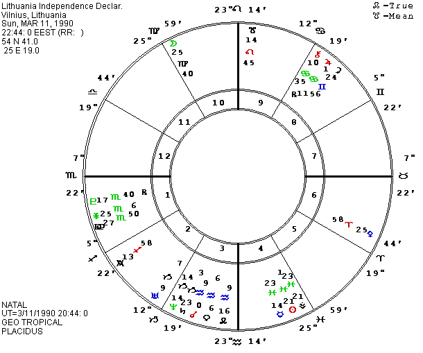 In the interval since I reported a tentative chart for Lithuania set for the time the news of their declaration of independence reached Washington, DC, I have learned the actual time of the declaration. It was published in Vilnius with banner headlines: March 11, 1990 at 22:44, two hours from UT. The chart features a full moon, with the Moon on the cusp of the eleventh house at 25 Virgo and a Sun-Vesta conjunction at 21 Pisces. Ceres in Gemini in the eighth house forms a T-square to the Sun and Moon. Scorpio is rising with Pluto trine Mercury in Pisces and Juno and East Point also in Scorpio trine the Sun-Vesta. Chiron just inside the eighth house in Cancer forms a grand water trine to Pluto and Mercury, suggesting that the people will be helped by others, but so far the economic pressure imposed by Gorbachev’s blockades far outweighs any help received from the other Baltic republics, Poland, or other countries. As mentioned above, Yeltsin has just opened a dialogue which may force the hand of Gorbachev. The independence chart is presented in Asteroid-World with geocentric positions in the center circle and heliocentric positions in the outer circle. The Ascendant is closely square Venus, fitting the financial pressures, and it is also octile-trioctile the Sun-Moon opposition. The MC is exactly quincunx Saturn, the natural ruler, an appropriate aspect for the change in the handling of executive power and the potential for power struggles. But Saturn also trines the Moon and is sextile Sun-Vesta so I think that things will work out in the end. Gorbachev’s policies will backfire in the end since he is forcing the republic to become more autonomous as well as increasing the cooperation between the three Baltic states. The internecine friction within the U.S.S.R. has been increasing as republics and cities have started keeping their scarce supplies for their own people, but once such a process starts, it is hard to reverse it and return to cooperation. And a country cannot survive if its parts cannot work together.