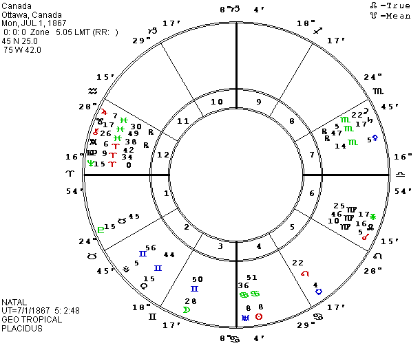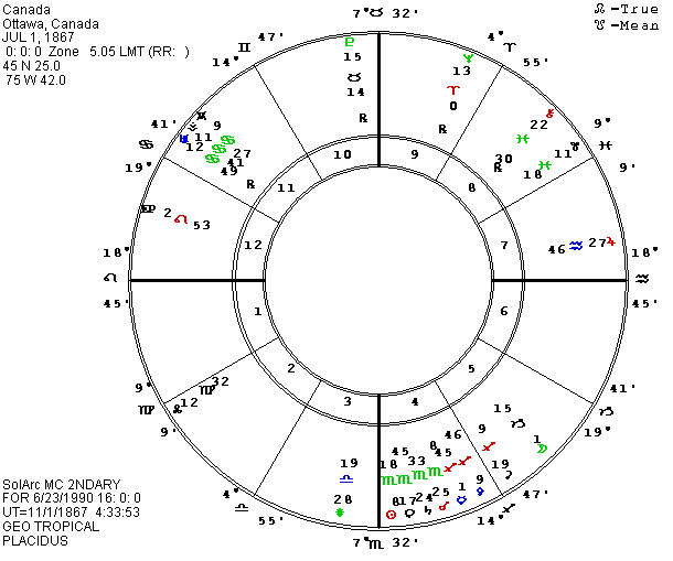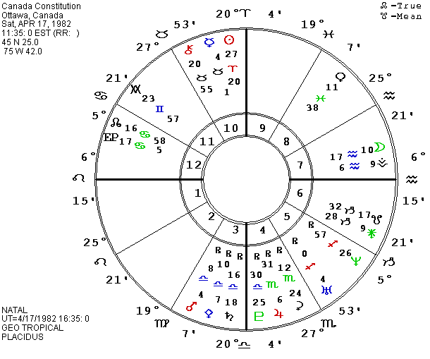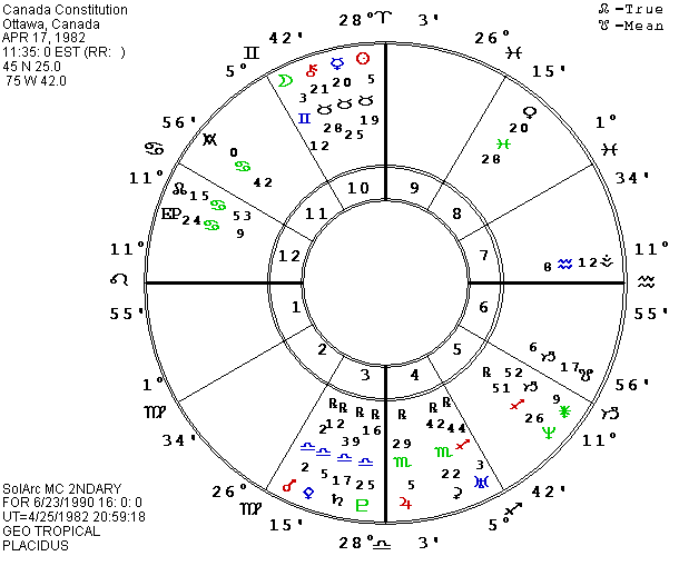 We have two charts for Canada, both from The Book of World Horoscopes by Nicholas Campion. Canada became independent from Great Britain on July 1, 1867 at 0 A.M., LMT. The charts would be calculated for Ottawa, the capital of the country. On April 17, 1982, at 11:35 A.M. EST in Ottawa, Queen Elizabeth of Great Britain signed a new Canadian Constitution. The chart for the Constitution shows the most dramatic change at the present time, suggesting that a constitutional change is more likely than a major breakup of the country. This implies that the Meech Lake agreement will produce some kind of action, even if it is not signed in its present form. In the 1982 Constitution chart, P Sun is opposite P Jupiter across the tenth and fourth houses which fits a change in the government structure that affects the land or the people. At the deadline for agreement, June 23, 1990, P Moon is opposite natal and P Uranus, again suggesting possible dramatic events for the people, including rebellion. P MC was opposite Pluto when the Meech Lake agreement was signed, pointing to the potential for power struggles over the action, and P Pluto remains opposite the MC in Quebec for well over 100 years. P East Point will start a square to P Pluto by early August, 1990. P Antivertex is approaching a square to P Mars. P Ascendant opposes P Vesta across the first and seventh houses, another indication of possible power struggles and separation, and it is also trioctile Neptune which can indicate tension between ideals and personal action. Often, this aspect just means that we want more than we can have. P Mercury on Chiron is appropriate for thinking and talking about legal matters if you accept Chiron as similar to Jupiter. The chart certainly points to immanent change.
