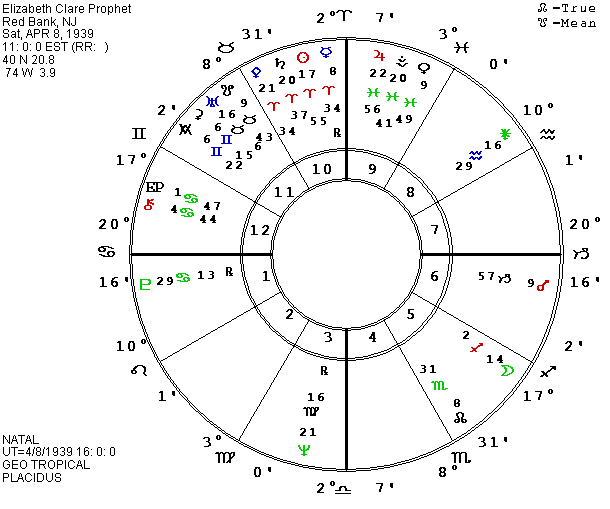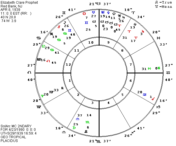 The other reason for pushing ahead with this Asteroid-World is that the recent Data News from Lois Rodden reports a typo in the information on Elizabeth Clare Prophet. Unfortunately, I did not look for the noon chart I had once done for Prophet. I remembered a fire emphasis with an Aries stellium, assumed that Lois’ data was ok and used her information for the chart delineated in the last The Mutable Dilemma. It is pretty amazing how appropriate the wrong chart was, but I have seen that happen often in astrology. According to the new information from Lois, Prophet was actually born in 1939 instead of 1919. The earlier year put progressed (P) Jupiter on the Ascendant for years. The 1939 chart puts P Jupiter on the MC for years. Instead of P Elizabeth conjunct Neptune, we have it opposite the Ascendant (along with P Michel for Mikhail) as Prophet prepares to take her followers underground to escape a potential attack from Russia. So please mark in the article on Prophet in the Gemini 1990 Mutable Dilemma that the chart is wrong, and that the correct (we hope) chart is to be found in this summer 1990 Asteroid-World.