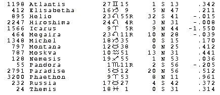 Of course, there are lots of interesting asteroids in Prophet’s horoscope. In addition to the ones already mentioned, the current belief that Karma-time has arrived would fit P Themis on the MC and P Jupiter, while P Nemesis is on the Moon and trioctile Pluto. Themis was a goddess associated with the LAW in ancient Greece, and humans who flouted the LAW were found and punished by Nemesis. I was eager to locate the asteroid Russia, since Prophet seems to see that country as the major threat if we can believe the newspaper reports. Natal Russia is 17 Taurus 27, so P Uranus remained conjunct it for many years though it is now out of the one-degree orb. P Russia was at 7 Gemini 22, just 3 minutes of longitude from Prophet’s P Sun on April 23, 1990, the day reported to be the beginning of Karmic reaping for the world. Natal Moskva (Moscow) was at 10 Aquarius on Prophet’s eighth house cusp, and on April 23, 1990, P Moskva was 29 Aquarius 41, conjunct P Juno which is very Plutonian and quincunx P Pluto to the minute. P Byelorussia (the U.S.S.R. Republic where Chernobyl was located) is at zero Leo, within one degree of both P Pluto and P Ascendant in Montana as well as opposite P Mars and square natal Pandora. On the day before the “karmic due date,” the quotidian (Q) P MC in Montana formed a grand cross in fixed signs and cardinal houses involving the factors just mentioned: P local Ascendant, P Mars, and Pandora (who opened the box of the world’s troubles in the myth). The grand cross in mixed cardinal and fixed qualities is an indication of power struggles and it is important to look for “healthy” game-playing ways to have them. Quotidian angles move about a degree a day since they circle the wheel plus one degree more in a year.