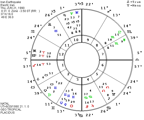 I am not sure about my data for the Iran earthquake, but I am working with a time of 0:31 A.M. on June 21, 1990. The epicenter was north of Rasht, but hundreds (or thousands) of people were killed over a wide area. The Ascendant in Rasht was just moving into a square to Uranus and the rising Mars in Aries had recently left the one-degree-orb square to Neptune and was exactly opposite the Arabic Part of Uranus. The latter is calculated by adding Uranus to the Ascendant and subtracting the Sun. It is possible to use the same formula with each of the planets. It produces the Part of Fortune when the Moon is added to the Ascendant. I interpret the different variations as a place of personal action (Ascendant) of the nature of the added planet without drawing on the growth potential of the Sun which is subtracted in the formula, so the part of Uranus implies Uranian activity. Though the major damage and the deaths occurred in the northern part of Iran, the angles at the capital, Teheran, were quite striking. Some of the reports suggested that some of the authorities actually blocked material sent by other countries to aid the stricken people. The Teheran Ascendant at the start of the quake was square Uranus within one degree as well as square N Jupiter and it was exactly opposite Gaea (earth) and S Mars.