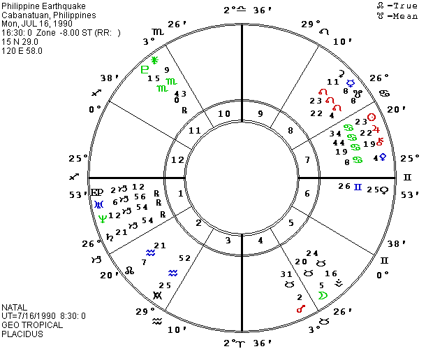 The Philippine earthquake was reported to have occurred at 4:30 P.M. on July 16, 1990, but there were also many strong aftershocks which did additional damage. It also has some interesting asteroids. Of course I looked first for the asteroid Philippina, and found it in the eighth house within one degree of Atlantis with both holding a quincunx to the rising Saturn and a trioctile to Uranus which is even closer to the Ascendant. The death toll keeps rising, at this time of writing having topped 600. As is usually the case, most of the deaths must be blamed on poor construction of the buildings, including several modern U.S. hotels in Baguio. Vesta was within two degrees of the opposition to Pluto which was mentioned in the subway fire, and it was trioctile the East Point in the first house. Pluto was also on the midpoint of the Ascendant/MC, considered one of the most important midpoints. S Vesta as well as S Jupiter were within one degree of the first house Uranus, reinforcing the message about questionable workmanship and values. Mars was quincunx the MC from the cusp of the fifth house but still barely in the fourth house. The Moon was just three degrees beyond Mars, showing the tension of the people, and the lunar nodes also squared the Moon to repeat the message. Many people claimed that the government was very slow to act and incompetent when it did. Other stress aspects included the Jupiter-Sun conjunction on N Saturn and their opposition to both Saturn and S Saturn. (Saturn repeatedly crosses its own south node this year). Richter and Pele were just over one degree apart in Leo in the eighth house, but both were in a one-degree-orb octile to Vesta for the crisis connecting health and workmanship. Hiroshima was on the Ascendant, and the pictures of the collapsed hotels really did look as if a bomb had hit them. The Arabic Part of Jupiter was also on the Ascendant while Venus exactly opposed it. So much for the “benefics” on the angles.