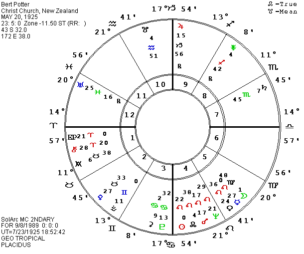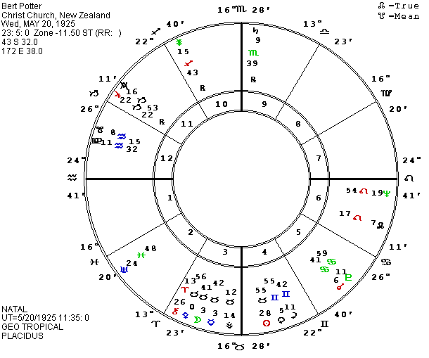 I’m back from my second trip to New Zealand during this year, and more than ever impressed by the beauty of the country and the great people I’ve met. Maritha and I visited Christ Church, Nelson, Wellington, Palmerston North, Havelock North, and ended at Auckland. Maritha had to go back to work at ACS and I stayed on to enjoy some additional sight-seeing. One of the most delightful excursions was to a spiritual community named Centrepoint which is not far from Auckland. I have the horoscope for the founder, Bert Potter, and for the arrival of the first occupant of the community, and they offer a fascinating picture.