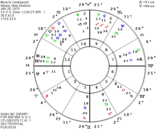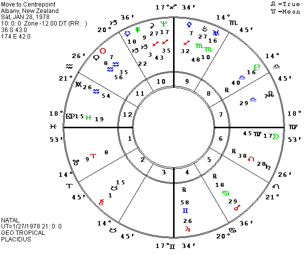 Many more asteroid aspects could be mentioned, but we had better go on to the chart for the occupancy of Centrepoint if we are to have any space left to discuss some of the possible horoscopes for the country of New Zealand. I can’t imagine a more appropriate chart for the founding of a “spiritual and therapeutic community” than a chart with Pisces rising, Neptune on the MC, a Virgo Moon on the Descendant, and Jupiter in the fourth house in Gemini for the emphasis on an extended family (Gemini for siblings and other relatives) which specializes in equality and communication (air principles). Equalitarian values are paramount in Centrepoint and that includes an avoidance of sexual stereotyping. Men can care for children and women can be leaders in the craft businesses which help to support the community. The mixture of “father” and “mother” roles shows in the chart with Mercury ruling the fourth house and placed in the tenth house while Jupiter rules the tenth house and is placed in the fourth house. Ceres, usually a key to mother along with the Moon, is also in the tenth house which is a little more likely to signify father while the fourth house signifies mother.