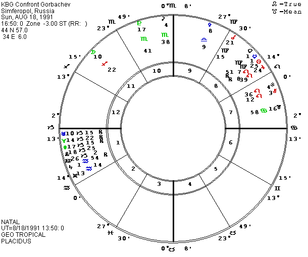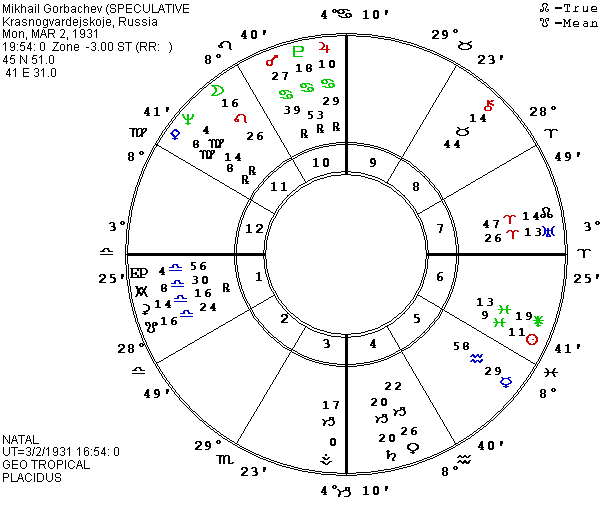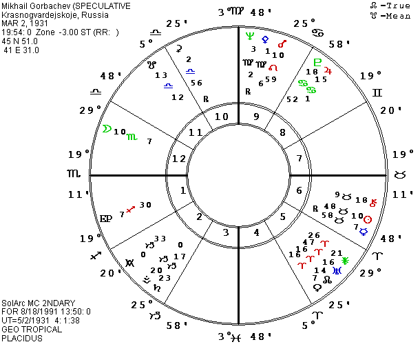 I have been using a rectified chart for Gorbachev with Uranus rising in Aries which seemed to fit his revolutionary role in the world, but in light of his performance in recent years as he tried to straddle the liberal and conservative sides, I am now testing a new speculative chart which is almost 12 hours later, putting Libra on his Ascendant. I had expected the major upheaval and power struggle (for Gorbachev personally and for the country) in the winter of 1991-2 when my previous chart would have brought P Moon into a fixed grand cross opposing P Sun and squaring P Mars and P Atlantis. The later birth time brings P Moon into that configuration during the summer and early fall of 1991, fitting the momentous crisis occurring at this time.