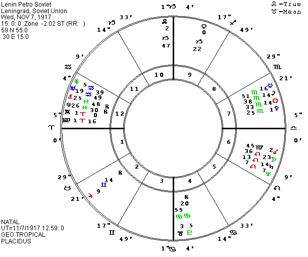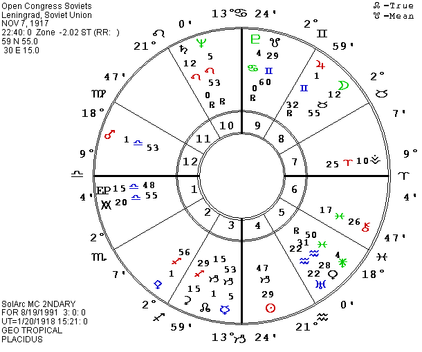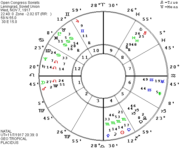 Now, however, though my new chart for Gorbachev continues to show tension for years, the P Moon aspects provide a better fit for the big showdown in the summer of 1991. This encouraged me to look again at another possible time for the Bolshevik revolution and the beginning of Communist power in Russia. Countries are born in stages and I have 9 different times during the 3-day revolution which could be logically supported as steps on the road to communist power. Life is not really tidy, despite our efforts to make neat patterns to explain and predict it. Countries usually have more than one chart which “works” to some extent and helps to “make sense” of the situation. Prior to getting the 3 P.M. chart, I had gotten the best fit of a chart with events in the history of the country using the opening of the Congress of Soviets at 10:40 P.M. Local City Time (LCT) on November 7, 1917 in Leningrad. This chart, like the later birth time for Gorbachev, advances the crisis aspects which picture the major changes in leadership and power from the winter of 1991-2 to the summer and early fall of 1991. The P Moon is still in orb of its long square to P and natal Neptune, to midpoints, and then to P and natal Saturn when it starts an opposition to natal Sun-Ceres. We will have to see what the coming months bring to judge the relative merits of the two charts for the country. P Moon will oppose natal Mercury later in the year, which would fit mental changes, communication, transportation, etc., but the simultaneous conflict aspects to Saturn and Sun are most appropriate for the changes of power figures and laws.