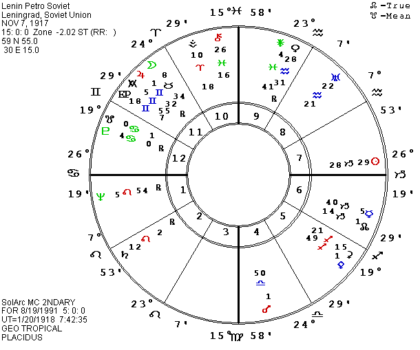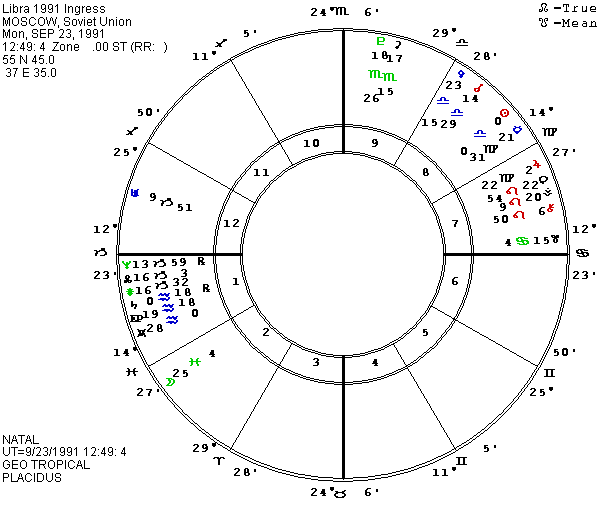 Many other aspects might be mentioned, emphasizing the combination of stress but still hope. P Mercury is opposite Pluto and square Ascendant-Descendant, (with a 3 P.M. time), forming a cardinal cross: independence, dependence, equality and power. P MC in Moscow just started a quincunx to natal Moon, fitting the shift of power from the traditional leaders to the people and also fitting the separation of several of the Republics from the executive power of the central government. As this is written, one Republic after another is declaring independence from the central government. P Moon just ended a square to natal and P Neptune but it will continue to square the midpoints of natal and P Neptune and Saturn until it moves into the square to P and natal Saturn during the winter of 1991-2, which seemed to support the timing I was getting from my speculative chart for Gorbachev.