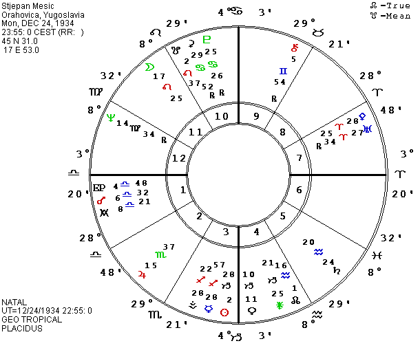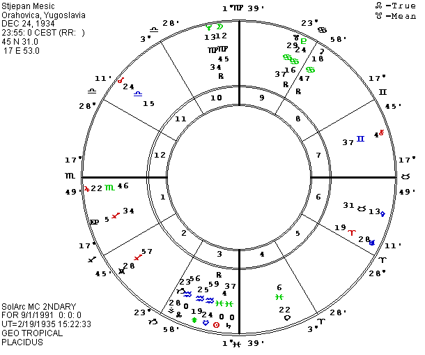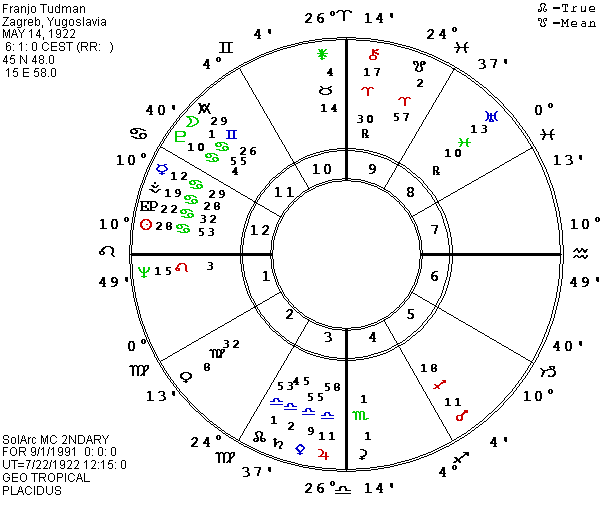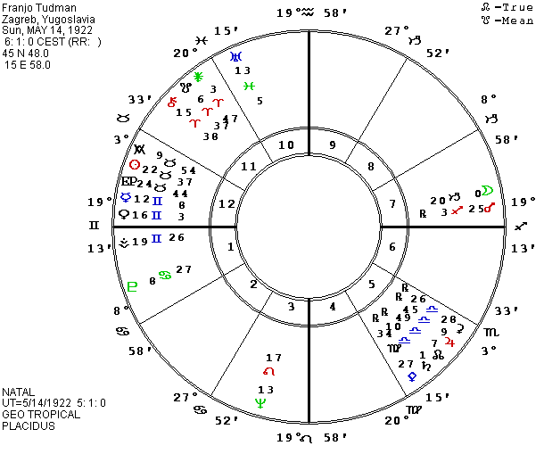 In the midst of the Soviet drama, the media has almost forgotten Yugoslavia’s ongoing civil war between two of its Republics, Serbia and Croatia. In contrast to the refusal of Soviet military forces (KGB, army, air force and navy) to kill their own people, though part of the same country since 1945, the Serbs and Croatians have roots of mutual enmity which go back for hundreds of years. The Serbs have the advantage of greater numbers and a majority of the members of the armed forces of the country, and the national army is openly fighting on the side of the Serbian citizens living in Croatia who hope to make a section of Croatia part of Serbia. I have previously printed at least two horoscopes for the country, but have just received possible birth data for two of the Croatian leaders from the AFA’s latest bulletin. The data comes from a native of Yugoslavia, but the original source is unknown so we have to consider it tentative. Franco Tudman, the current President of Croatia, is said to have been born on May 14, 1922, at 6:01 A.M. (5:01 UT) in Zagreb, the capital of Croatia, 45 N 48, 15 E 58. [Web note: AstroDatabank has different time and place.] Stjepan Mesic who was to have been the next President of Yugoslavia in their system of rotating the office among citizens from the different republics, but who was blocked from assuming the office by the civil war, was given as December 24, 1934, at 11:55 P.M. (10:55 P.M. UT) in Orahovica, Yugoslavia, 45 N 31, 17 E 53. I am always suspicious that some astrologer has rectified the birth time when it is given so precisely, but at least the date and place should be accurate.