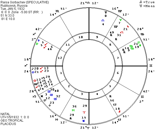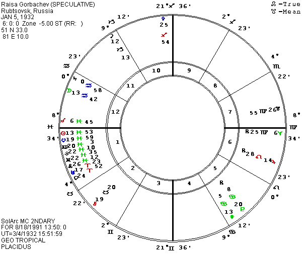 Raisa was born on January 5, 1932 in Rubvsovsk, 51 N 33, 81 E 10. Based on her activity, I suspect that she was born shortly before dawn with Sagittarius rising (for her education and career as a teacher of Marxist Philosophy) but with her Capricorn Sun, Mars, and Saturn also in the first house (for her atheism and ambition). Individuals with heavy first house Capricorn can alternate between “my will is law” and “the world has all the power and I’m helpless and vulnerable.” Intense anxiety often accompanies the latter state. A speculative chart for Raisa set for 6 A.M. (UT 1 A.M.) puts the asteroids Russia and Hybris (hubris) on the local MC in Moscow and Michel (for Mikhail) on the IC in Moscow. P Moon would be at 13 Aquarius for the coup, in a square to her natal Ascendant in Moscow. P Raissa (her namesake asteroid though it has an extra “s”) would be conjunct her Antivertex and P Ascendant in Moscow. Regardless of birth time, P Winchester, so often associated with guns, is conjunct P Mars with both opposite Neptune. Her faith has definitely been challenged. Mikhail may have some faith in a Higher Power, thanks to a mother and a grandmother who were believers, but Raisa’s orthodox atheism may have provided little support when she faced potential death. In Stalin’s day, her prospects would have included torture. If this birth time is close to accurate, Raisa now has P Philosophia conjunct P Ceres approaching natal Sun. She may be approaching a change of both job and philosophy. There are many other relevant asteroids, but I will just mention that her P Moskva at 19 Aries is conjunct natal Atlantis (for power abuse) and they square natal Mars and Juno which oppose each other across Capricorn-Cancer. The July 11, 1991 eclipse at 19 Cancer made a direct hit in what becomes a cardinal cross when we include Apollo (a Sun god for power and fame) at 20 Libra. The January 1992 eclipse will put Sun-Moon-Uranus on Raisa’s natal Sun square her natal America and opposite her P Juno. Something important is coming for the Gorbachevs.