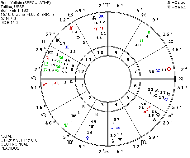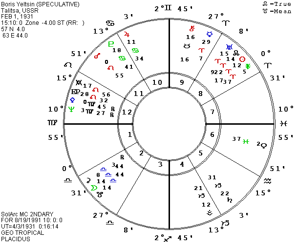 The chart certainly indicates issues involving power. The Capricorn stellium is in the Aries house along with the Antivertex and Saturn (ruler of Capricorn) in the sign it co-rules, Aquarius. In the Scorpio house are Jupiter and Sun in Leo and three planets in Virgo. Mars in the eighth house is an especially important indication of the issue of personal power versus shared power. Ceres and Pluto are both in the sign of Scorpio (the lesson of shared power) in the house of Capricorn, the LAW including authority figures who enforce it. The total emphasis on letters one, five, eight, and ten certainly hammers in the issue of learning to deal with power. If the place and time are close to accurate, Saturn is almost exactly square the midpoint of the natal and local (Moscow) MCs, one of many ways to symbolize a conflict between personal will (first house) and the limits of personal will (tenth house). Chiron and Vesta in Leo in the seventh house and Ceres-MC form a T-square with Saturn, and the asteroid Russia at 4 Taurus completes a fixed grand cross in cardinal houses; a classic picture of a power struggle. Mars is in an applying square to the Moscow Ascendant, fitting the fact that the armed struggle actually occurred in Moscow.