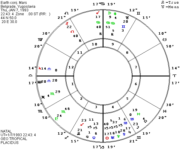 Mentioning just a few of Milosevic’s asteroids, both George and Henry at 15 Taurus conjunct natal Jupiter and Saturn, Phaethon is on Pluto, Dan at 11 Pisces is octile the 2:30 A.M. MC, and Williams at 20 Aries is semisextile the Moon and quincunx Pallas. If this birth time is close to accurate, P Moon during the coming winter will square P George, P and natal Uranus which are retrograde in the tenth house, and it will oppose the natal Sun. P south lunar node will start a conjunction with natal Yugoslavia about the beginning of 1993 while for some years P Yugoslavia continues a trine to natal Ascendant-P Chiron and a quincunx to natal Mars. P Henry is on P Jupiter-P Saturn with all of them square P Vesta—not a friendly combination. Natal Herberta was opposite Pallas and just past a conjunction with natal Moon. P Herberta has retrograded to conjunct natal Daniel for some years as well as holding a quincunx to the north lunar node in Libra in the third house. P Daniel is quincunx Pluto and P Dionysius, the nature god associated with drunken orgies and violence committed by his followers. P Williams is trine P Vesta and semisextile P Jupiter-P Saturn. P Washingtonia squares natal Williams and is octile P Venus. P America is quincunx natal Vesta. So far, the new Serbian President who has been an American businessman has not been able to stop the violence which has actually been escalating. The Earth-Mars conjunction chart for Belgrade not does look encouraging for peace in our new world order.