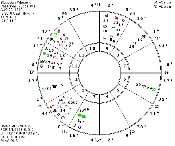 We have previously presented possible charts for leaders in Croatia, but have not mentioned Slobodan Milosevic who seems to be one of the instigators of the Serbian attacks on their neighbors. The AFA has received two different birth times for Milosevic, 2:30 and 3:20 A.M. I don’t have enough events to do a rectification, but I’m leaning toward the earlier time which puts Pluto in the first house close to the Ascendant and the south lunar node exactly on the MC for lessons in handling power. Of course, we have to consider the data speculative. His date is August 20, 1940 in Pozarevac, Yugoslavia, 44 N 37, 21 E 11. Both possible birth times put his Jupiter-Saturn conjunction in the tenth house for his worship of power. His Sun is exactly square Uranus and his Moon widely trioctile Pluto. The 2:30 birth time also puts P East Point conjunct Mars and P Chiron in a long conjunction with the Ascendant for the potential of an identification with God. Though the cities are not far apart, relocating Milosevic’s chart to Belgrade moves the angles just enough to put his P Sun in a lifetime trioctile to his local P MC for perpetual power struggles. P MC for 2:30 is also trine P Mars and sextile P Pluto for Serbia’s continuing military success so far.