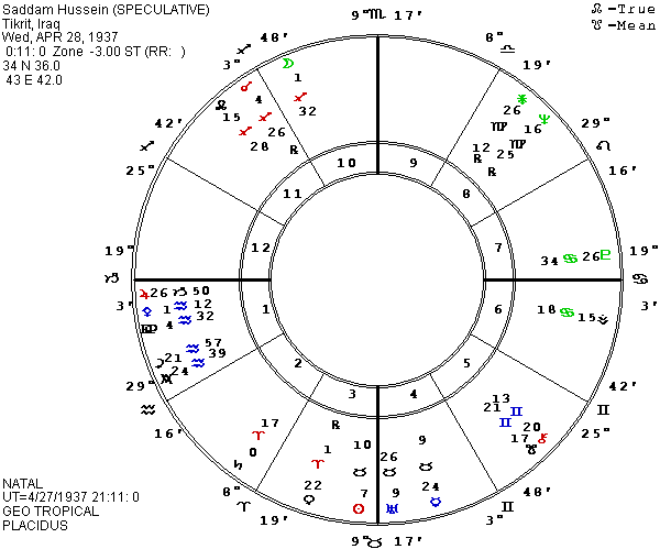 During the spring of 1992, Saddam’s P Moon was quincunx his natal Sun as he tweaked the tail of the eagle. This summer and fall it is holding a long quincunx to natal and then P Uranus. It will be ending the aspect just before our November election but then P Moon will quincunx P Venus, ruler of the fourth house if this birth time is accurate. In the fall while the Moon-P Uranus quincunx is still present, P Moon will be octile natal and P Jupiter and trioctile natal and P Pluto which oppose each other across the first and seventh houses. It looks like a stormy fall for Saddam.