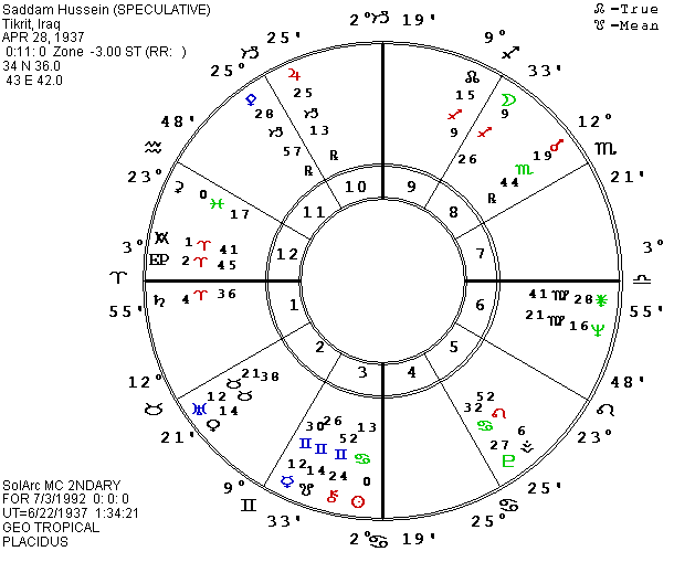 The Iraq chart that has worked the best for me is set for the beginning of the Iraq Republic by a military coup starting at 5 A.M. on July 14, 1958. During this summer of 1992, P Moon in this chart has been square Saturn and Venus and quincunx Chiron in the eighth house though it was also sextile natal Ascendant and Sun. P Ascendant is conjunct Mercury and Juno (like another Pluto) and square P Mars, so the potential for conflict is there for many more months. But the Moon is less aspected in the early fall, so Saddam may provoke some kind of action but the danger of a major attack and possible overthrow of the executive would be more likely in late October just before the election when the P Moon starts a quincunx to the tenth house Mars-P south lunar node. There are rumors that Saddam is getting astrological advice. If so, I wonder what they are telling him? One of the reasons I am drawn to the 0:11 A.M. chart for Saddam is that this Iraq horoscope has its Ascendant on my new Descendant for Saddam and the P MC for Iraq is conjunct Saddam’s Uranus so it opposes his MC. He had better pull in his horns.
