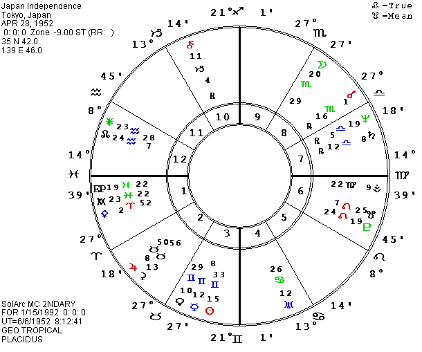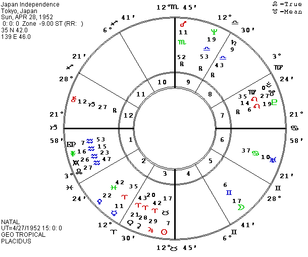 In addition to the U.S. election which will occupy a lot of time and space in the media this year, the current name-calling spat between Japan and the U.S. is getting a lot of attention. Japan became legally independent of U.S. military occupation on April 28, 1952. Their horoscope might be drawn for 0 A.M. in Tokyo or for the time of their official ceremony. I have usually found that the legal time (0 A.M.) worked well in such cases. The horoscope for that time puts P Moon in Scorpio in the tenth house in an opposition to P America, fitting our mutual anxiety over security and power. P Herberta is on the Descendant within four minutes of longitude, and when the chart is relocated to Washington, DC, P Herberta is on the Ascendant within 20 minutes of longitude. The Ascendant-Descendant conjunction is a beautiful picture of our alternation between being partners and open enemies. The Japanese chart also has strong connections with Bush’s chart. The nodes are reversed, north on south, and Japan’s Antivertex is also on Bush’s south node and Mars. In its own chart, Japan has natal George opposite natal Nippon and octile natal Tokio, aspects which fit their uneasy relationship with our President. P Nippon (Japan) is conjunct P China and P Fortuna, square the P nodes and P Juno, and quincunx P George and octile natal Herberta. The Japanese are investing increasingly in China. Another fascinating hint about the nature of the Bush-Japan relationship is the latter’s P Icarus conjunct Bush’s natal Icarus. Regular readers will remember some incredible charts where two people had a mutual Icarus conjunction and acted out a variety of what the French call “folie a deux,” doing things that neither would have done without the spur of a mutual love/hate relationship. There are lots more aspects but I will just mention that natal Daniel is two degrees short of a conjunction with the Descendant in Japan’s chart, limiting ourselves to the usual one-degree orb, and P Washington is currently conjunct Daniel approaching the Japanese Descendant. Is our Daniel going to play a role in Washington’s interaction with their partner-rival?