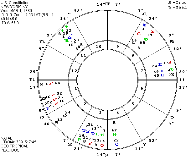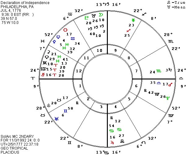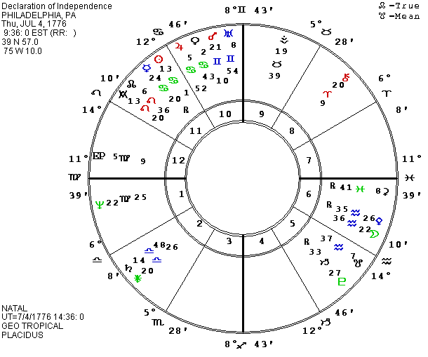 Turning to the Declaration of Independence, we hit one of the biggest controversies in astrology, the arguments over the timing of the chart. I am sticking with the 9:36 A.M. EST time of my rectification as the chart which “works” best in my tests. A Scorpio rising chart is now being promoted, supposedly based on a record, but I cannot make the chart fit our history. It is possible to have several charts for an organization or country since they are born in stages. The time I am using is based on the recorded order of business and is presumably the time the Continental Congress voted on the final wording of the Declaration. Hancock may have signed it later, but the will of the group was expressed in the vote.