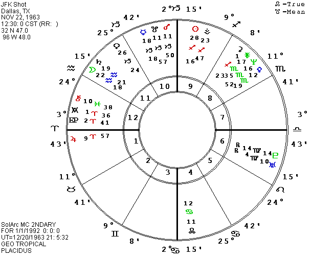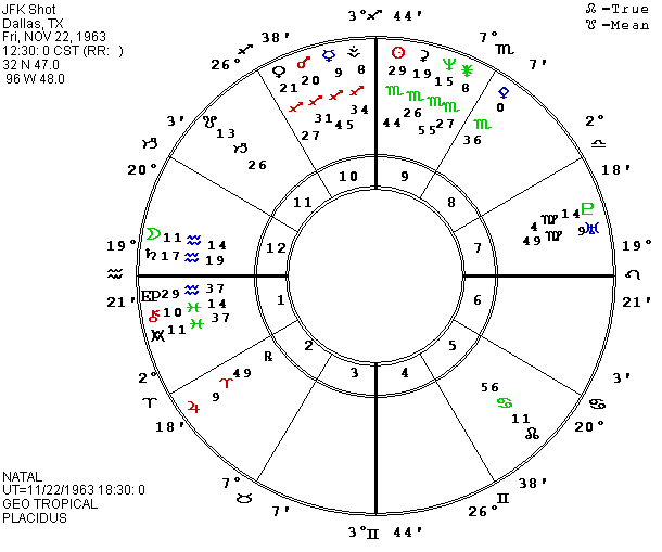 A recent movie about the assassination of John F. Kennedy has widened the public’s awareness of the controversy about his death. Many people have doubted that Kennedy was killed by Oswald. A movie taken at the time seemed to show a hidden person in the bushes ahead of the cavalcade. It was apparently edited to remove the person who was later identified by some people as one of the Watergate burglars. I have previously written about being told by a personal friend that a friend of hers was one of the nurses on duty in Dallas when Kennedy was brought into the hospital immediately after the shooting. The nurse said positively that Kennedy was killed by a bullet in the throat which came from in front of him. The only way to account for the medical statements made by doctors in Washington is to assume that someone did some corrective surgery to change the appearance of the wounds. Of course, such a story is third hand by the time it reached me, and worth nothing in a court of law. The December 23, 1991 issue of Newsweek magazine carried several articles about the controversy and the movie, JFK. They carefully included reviewers on both sides; some who said the movie distorted history and was “crazy,” and others who pointed out that there was some evidence that the Mafia and CIA might have had a hand in the killing. At the time, both John and Bobby Kennedy were trying to curb some of the power of the Mafia which is said to have cooperated periodically with the CIA in the latter’s operations. A few people who offered evidence supporting CIA and Mafia involvement either died mysteriously or disappeared. We may never get the full story but the chart for Kennedy’s shooting has some fascinating aspects as this new movie re-opens the past.