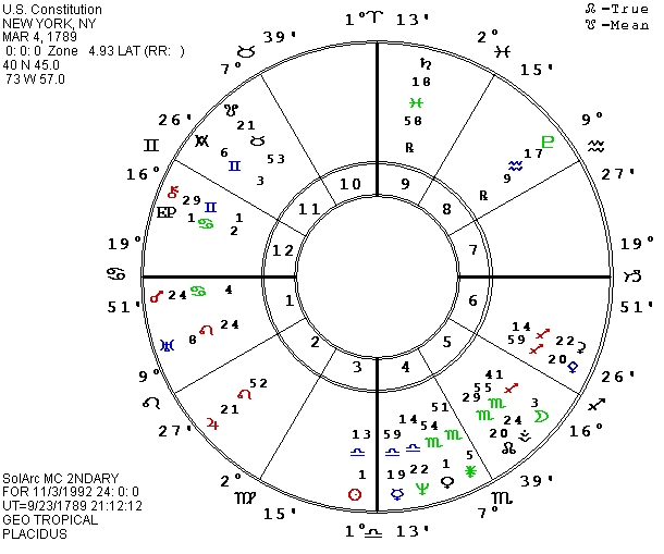 At first, it looks hopeful for Harkin when we see P Venus conjunct N Thomas, but then we note that P Venus is square Uranus, quincunx P MC and south lunar node (a yod), and octile the East Point with a weak semisextile to P Sun the only possibly supportive aspect. Many astrologers still have some doubts on whether to consider the semisextile a harmonious or a stress aspect, and it may depend on the planets, signs, and houses involved. The Constitution P Sun does not reach the semisextile to natal Thomas until six months after the election, about the time that P Moon is starting squares to the local and then natal MC and to natal Saturn-Sun. The spring of 1993 looks tense. The asteroids with the names of the other Democratic contenders look equally dubious in the Constitution chart progressed to the November 1992 election. P Williams squares the local Ascendant. P Roberts is quincunx the Ascendant. P Roberta is opposite P Saturn and quincunx Pluto. Patricia rang bells in the Constitution chart. P George will be ending a square to natal Patricia during the summer of 1992, presumably after Patrick has given up. P Karma is quincunx Patricia, but the crowning touch is P Pluto holding a lifetime (so far) conjunction with Patricia while P Patricia in Pisces is in a very long term opposition to the MC in Washington, DC. What a picture of an isolationist who wants to shut out the rest of the world to protect the worshipped homeland.