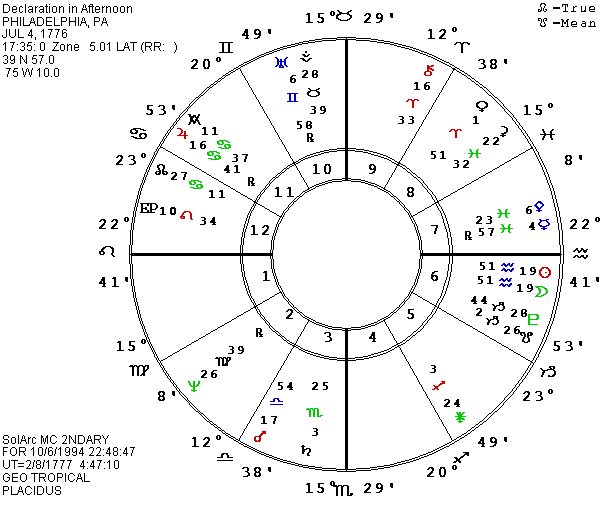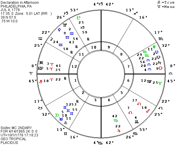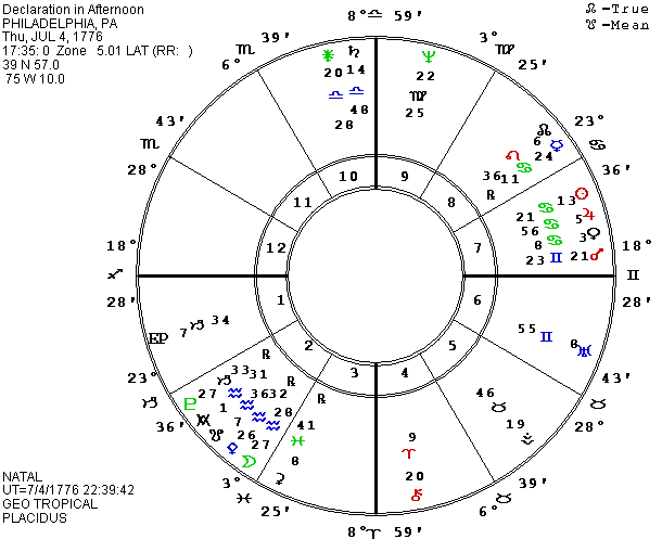 The “new” time for our Declaration of Independence is 5:35 P.M. LAT or “local apparent time,” the time which would have been on a sundial. LAT was used into the 19th century when it was gradually replaced by LMT (local mean time) which was in turn replaced by our modern time zones. For astrologers who do not have the CCRS computer program and who lack the ability to calculate LAT, I would not quibble over a minute of longitude which is produced by a change of only seconds of time. You can just put 9 Libra on the MC for your own exploration of this chart. Any rectified chart remains questionable, so the more astrologers who test this one against both events and local angles, the better. The natal chart is set for Philadelphia, Pennsylvania where the Continental Congress issued the Declaration. Local angles should always include Washington, DC after our government moved there, as well as any other place where we had major events.