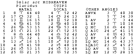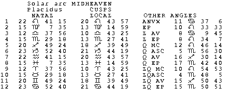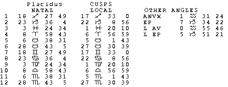 The “new” time which I am presenting here is only 3 degrees away from the one which put Mars on the Descendant, but it makes a stunning difference in the precision of the aspects involving both natal and progressed angles for our past events and in the aspects to the local angles in areas of the world where we have had major events. I have been working with what I call “local” charts since about 1958 when I discovered that the angles (Ascendant, MC, etc) in a new residence or the site of an event could be just as important as the angles for the birthplace. All of the aspects to the angles are part of the picture, though conjunctions are the most important aspect, showing an intense confrontation with the principle of the planet(s) forming the aspect.