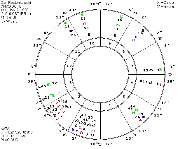 I am indebted to Chicago astrologer Sonja Foxe for Rosty’s data: January 2, 1928 at 2 A.M. in Chicago, IL. His local chart is calculated for Washington, DC. Rosty’s chart shows an interesting mixture of idealism and practicality. Neptune dominates the chart from the tenth house of career and it is closely quincunx Jupiter and Uranus in its sign of Pisces in the fifth house. Jupiter is, of course, a co-ruler of Pisces and it also rules a corner of the first house of personal identity. Pluto, ruler of the Ascendant, is in the Sagittarian (ninth) house, repeating the identification with idealism in some form. Both Mars and the Antivertex in Sagittarius say it again. Yet our two major lesson factors, Saturn and the south lunar node, are also in Sagittarius so we know there is some kind of challenge in the area of beliefs, values, ethics, etc. Chiron, which is like Jupiter, is also prominent conjunct the Descendant, reiterating the high focus on faith and ideals.