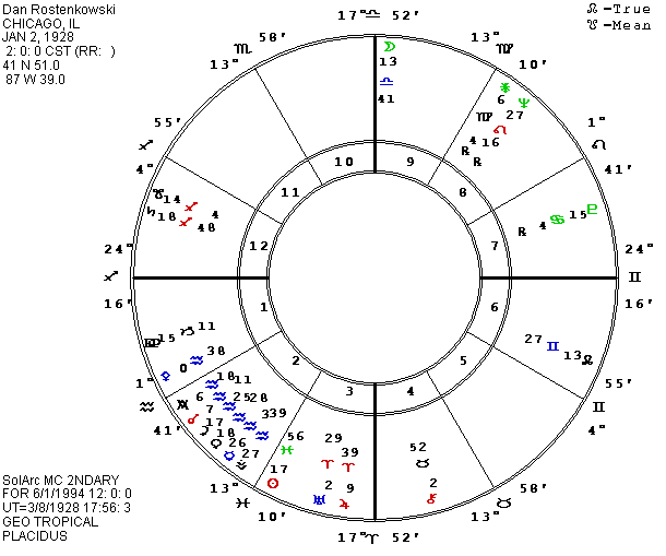 Rosty’s P Moon will cross his P MC during September-October 1994, so the fall will be an important showdown time. P Sun is square the lunar nodes and P Saturn and opposite America, not very encouraging aspects. P Sun is also conjunct Philosophia and Makover as Rosty considers his future. P Makover is conjunct N Darwin, square Pluto, and opposite N Chicago reinforcing the message of a struggle for survival. In every chart, there are mixed aspects, some harmonious and some conflict ones. Rosty’s most positive aspect is a trine from P Jupiter to his natal MC but P Jupiter is also coming to a square to natal Sun. The patterns look like a change of career. Rosty probably won’t get totally off the hook, but I think the prosecutor will also not get all he asks for. The consummate pol will probably be able to find a compromise somewhere in the middle.