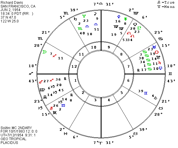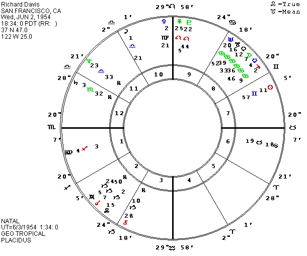 Though their lives could not have been more different, Richard Allen Davis and River Phoenix had a few things in common. Drugs helped to lead both to death; River to his own premature death; Richard to the kidnapping and murder of 12-year old Polly Klaas. According to the San Francisco Chronicle, Richard Davis was born in San Francisco on June 2, 1954 at 6:34 P.M. PDT. The reporter included the hospital where Davis was born, so the data looks authentic, and the chart fits a life on the edge. The data reached me through Lois Rodden’s Data News.