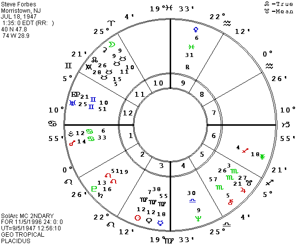 Thanks to Lois Rodden, we now have the data of Steve Forbes from his birth certificate. He was born on July 18, 1947 at 1:35 A.M. EDT in Morristown, NJ, 40 N 47.8, 74 W 28.9. His potential for inherited wealth shows clearly in his chart with a grand trine in water signs including Jupiter in Scorpio, Pallas in Pisces, and a Cancer stellium of Venus, Mercury, Sun, and Moon. His Taurus Ascendant is closely sextile the Sun-Moon conjunction. Jupiter is a ruler of the eighth house and its placement in Scorpio sextile Mercury also fits the receipt of protection from others or from the past, whether from a partner, from return on investment, inheritance, etc. The water principle, planets, houses, and signs, are all related to emotional security and can be manifested through either nurturing others or being nurtured. Forbes also has a sextile from his first house Mars (personal power) to Pluto and Saturn in the fourth (water) house and a trine to Neptune, a water planet. His lunar nodes (water, like the Moon which is their source) are sextile/trine his MC with the north node in the first house again indicating power in Forbes’ own hands.