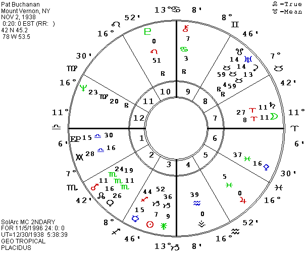 Turning to the chart of Dole’s other remaining opponent, Pat Buchanan was reportedly born on November 2, 1938 in Mount Vernon, NY. I am not sure of the source of his data, so hope it is correct. The time I have is 0:20 A.M. EST. To further muddy the waters, there is more than one Mount Vernon. I am using 42 N 45.2 and 78.53.4. The chart fits Pat’s style as a media gadfly. It puts P Uranus and P south lunar node on the MC for much of his life, showing a lesson in handling power and information. Pat’s Sun is in Scorpio widely opposite the MC, and if this time is accurate, he has an exact grand cross in fixed signs and cardinal houses for a power-struggle life. His Leo Ascendant matches his dramatic oratory with Jupiter opposing it on the Descendant, Mercury square from Scorpio, and Ceres square from Taurus. Pluto and the East Point in Leo, Venus and Juno in Sagittarius, and Saturn in Aries add to his fire. There is no doubt about his ability to excite and sway people though he is often a demagogue, preaching a gospel of extremism. In addition to Pat’s three factors in Scorpio, his Moon and Pallas are in Pisces and Chiron and his Antivertex are in Cancer. When the strong water houses are included, his capacity for emotional intensity is obvious. But, he also has enough earth to cope with the physical world. Mars in Libra provides Pat’s only air sign, but much of his water is in the air houses, a good combination for intuition, for the ability to tune in to people and sense how to reach them.