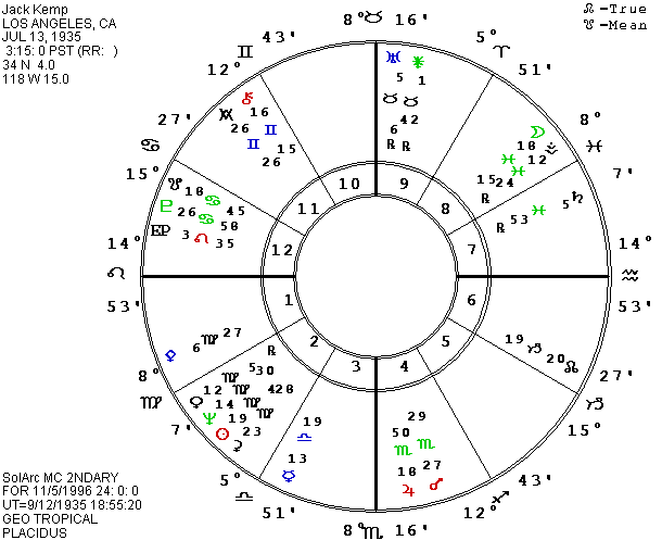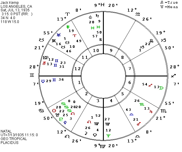 In light of Jack Kemp’s endorsement of Steve Forbes, and since we do have his data from a birth certificate, we might as well add him to our collection. Kemp remains a supply-sider despite the failure of the theories during the Reagan reign. Many thought he might try for the presidency, but when he decided against it, he encouraged Steve Forbes to run instead. Kemp is one of a number of prominent politicians who were born with Saturn on the MC. Though this is a tendency to move into a power position, his Saturn is in Pisces and the balance of Kemp’s chart is not particularly combative. Like Bill Bradley, the retiring Senator from New Jersey, Kemp was a sports star initially, winning his fame in football. He was born on July 13, 1935 at 3:15 A.M. PST in Los Angeles, CA.