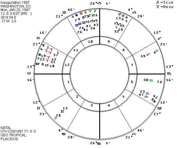 The reason I have been saying for months that I thought Dole might win in November is that the inauguration chart for noon on January 20, 1997 looks like a Republican win and the asteroid Roberta is highly favored. The tenth house is loaded in the inauguration chart, which is set for the traditional noon time of the oath of office by the new president. Three factors are in the tenth house in late Capricorn, including Ceres (fitting the emphasis of Pat Buchanan on workers and families), Neptune, and Jupiter. The Republicans have traditionally been associated with Jupiter as the party of wealth and our general tendency to make money into god. The close conjunction of Neptune and Jupiter highlights the importance of religious and moral beliefs. Their placement in Capricorn fits traditional beliefs and values and the association of the religious right with the Republicans. The Sun is always in 0 Aquarius for the inauguration, but next year it will be conjunct Jupiter within one degree, reinforcing the importance of Jupiter in the new regime but also showing potential tensions between the old and the new. Uranus is conjunct the Sun in its own sign to add support for the new, and Vesta shares in the conjunction to hammer in again the issue of jobs. Vesta is our super-Virgo, so its prominence can also point to the ongoing issue of health care. To add more weight to Jupiter with its potential for wealth, it is exactly on the MC when the chart is calculated for New York, the financial capital of the U.S. I think Wall Street will be happy.