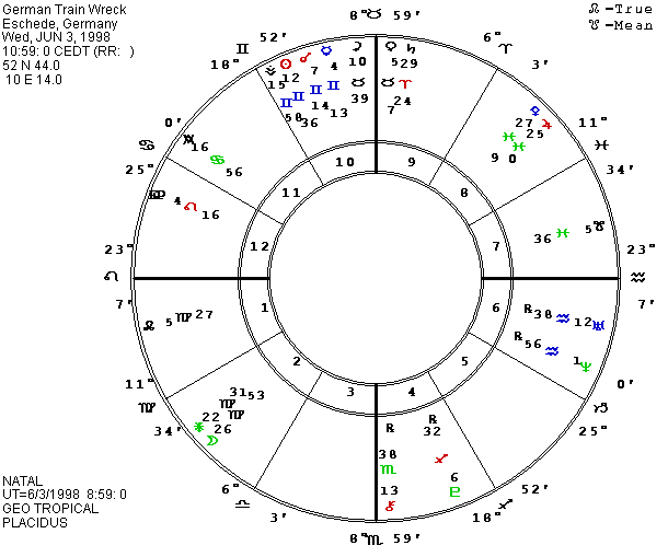 After a long detour through the wonderland of mutable curiosity, we had better return to astrology. One of our readers who was born in Germany was able to get the data for the recent train wreck, which was the worst in the history of the country. It occurred just outside the town of Eschede on June 3, 1998 at 10:58 to 10:59 A.M. The train is an extremely high speed one. A broken wheel derailed several cars, killing at least 98 people and injuring many more.