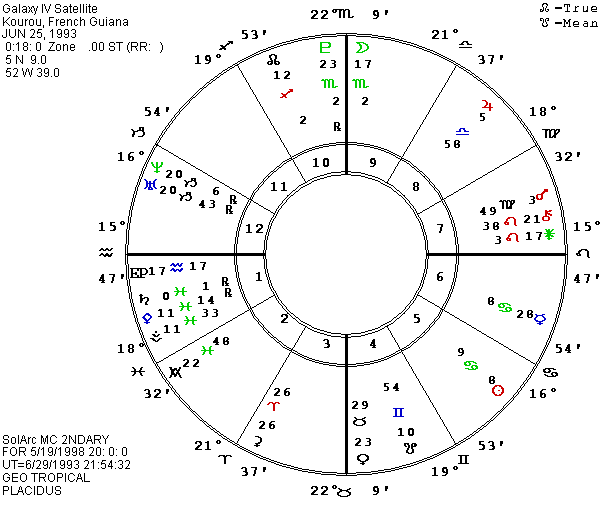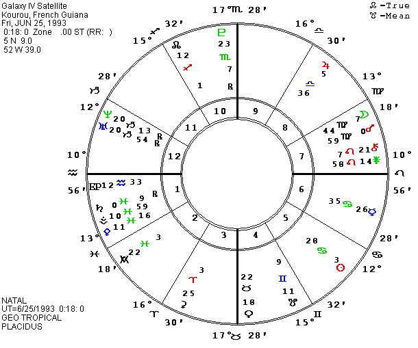 Data for another current event came from another Internet contributor who dug out the information for sending the Galaxy IV into space. This was the communications satellite which failed on May 19, 1998 shortly after 3 P.M., and left a lot of cellular phones and pagers stranded for hours or days. The satellite was launched on June 25, 1993 at 0:18 UT from Kourou, French Guiana, 5 N 9, 52 W 39. Galaxy IV had been in a stationary orbit over Kansas, but I am not sure of the time zone for the failure, which was discussed in the Los Angeles Times on May 21, 1998. Using CDT for the failure would put the transiting Moon on its own south node for a challenge to public security, and the nodes were square Pluto and Vesta in signs and houses of knowledge and communication. If the time and approximate place are accurate, a Pallas-Jupiter conjunction would have been opposite the Ascendant and square the MC. T Pluto was also quincunx Ceres and Mercury to repeat the emphasis on mutable factors, including communication and work efficiency. Four factors in Taurus, added to Juno and the north node and three angles in Virgo, highlight the need to deal with the material world. Uranus for modern technology squared Chiron in Scorpio and (more widely) Mercury in Taurus, to repeat the concern with financial matters.