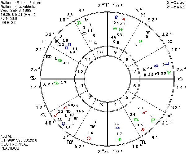The other lost U.S. rocket was a Delta, which exploded only 1 minute and 20 seconds after takeoff from Cape Canaveral, FL on August 26, 1998 at 21:18:20 EDT. Nobel was still retrograding in 1 Aquarius, but in this chart it was part of a grand cross made up of the midpoints of different planets and angles. It opposed Moon/Saturn, so it was actually on their indirect midpoint, plus it was conjunct Pallas/Pluto. Mars/Neptune in 1 Scorpio and Vesta/Uranus in 0 Taurus 51 completed the cross. The network of aspects in fixed signs was strengthened by holding octiles and trioctiles to a T-square of midpoints in mutable signs including Saturn/Neptune and Antivertex/south lunar node in Pisces, Antivertex/north lunar node in Gemini, and Moon/Mars in Virgo. At the actual takeoff just over one minute earlier, Saturn/north lunar node was on the IC and Saturn/south lunar node was on the Antivertex. However, this is a chart that astrologers would probably not have spotted as a problem, since the Ascendant and East Point were in a grand trine to Mars and Pluto in fire signs and the Sun was trine the MC. The failure was less costly and less important than the loss of the spy satellite, and in light of my time pressures, I did not hunt for more aspects to relevant asteroids.
