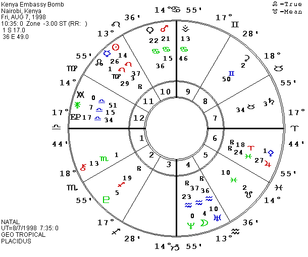 Far fewer people, and no Americans, were killed in the bomb which was set off just about 5 minutes later in Dar es Salaam, the capital of Tanzania. Only the angles of the chart change from the Kenya chart, with the East Point at 21 Libra and the Ascendant in 22 Libra moving into the Mars T-square and an octile to Pluto. The Part of Death in 11 Aquarius was just past Uranus.
