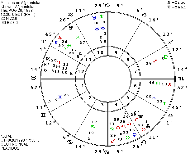 The U.S. retaliated by having missiles fired from ships in the Gulf to bomb a drug factory in Khartoum, Sudan and a reported training camp of Bin Laden in Afghanistan. The attack on Sudan may have been a mistake, since the evidence that it was manufacturing chemicals for biological warfare is being questioned. As with the embassy bombings, the U.S. coordinated the missile strikes to be simultaneous: at 1:30 P.M. EDT on August 20, 1998. The local times, of course, were quite different, so the house cusps are also. In Sudan, 22 Pisces was rising, the East Point was 23 Pisces, the MC was 24 Sagittarius, Attila (the Hun) was 25 Pisces, Jupiter was 26 Pisces, and the Antivertex was 27 Pisces. Justitia (justice) in 22 Gemini squared the Ascendant, and the strong mutable dilemma in the chart would fit both the moral issues and the accuracy of the judgment in the decision to act. Makover on the MC implies a change of some kind in the handling of power and responsibility by either the U.S., Sudan, or both. A cluster of asteroids in Virgo were involved, including Dunant (for the Red Cross) in 22, Paracelsus (an unorthodox healer) and Fidelio (connected to faith in Latin) in 23, and Urania (like Uranus) in 25.
