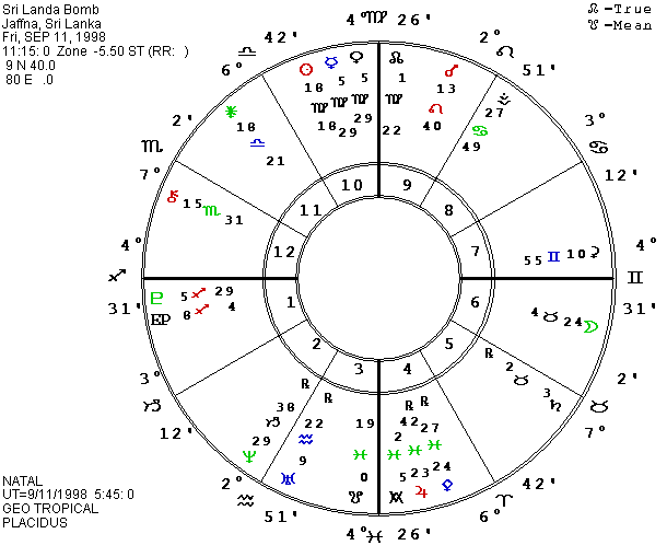 Another really destructive bomb was the one in Jaffna, Sri Lanka. Doc Cottle located the time from Reuters news: September 11, 1998 at 11:15 A.M., India time (which is 5 ½ hours later than GMT). Pluto was on the Ascendant within one degree, both in Jaffna and in Colombo, the capital of Sri Lanka, the former island of Ceylon. Recha, an asteroid which may be associated with religious tolerance or a need for it, was also on the Ascendant. Traditional astrologers might be shocked to find Venus and Mercury on the MC, but all three were closely square Pluto and the Ascendant. Fama and Belisana (war goddess) were also on the MC or on Mercury-Venus. The Antivertex on the IC reinforced the mutable cross. In charts close to the equator, the Antivertex axis can be anywhere in the chart. Medea (who killed her children) was also conjunct the IC and square the Ascendant. Achilles (a very destructive fighter in the Trojan War), Tisiphone (one of the Furies), and Astraea (human justice) were on the Descendant.