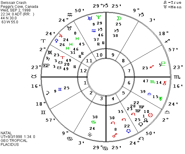 We will end with the more serious mysteries of the Swissair plane crash on September 2, 1998 just off the coast of Nova Scotia, Canada. After a variety of times were provided, the final consensus was that the plane hit the ocean between 10:30 and 10:35 P.M. local time, which was Atlantic Daylight Time. The place was just offshore from Peggy’s Cove, which was not in my atlas, but the ACT astrology list provided coordinates of 44 N 30 and 63 W 55. The area is some 20 to 30 miles south of Halifax and I have calculated the chart for 10:34 P.M. ADT. It definitely fits the mystery. Neptune was exactly on the MC. Darwin was on the Ascendant, but no one could be “fit” enough to survive a crash like that. Similarly for the IC, with Aeternitas (immortality) conjunct it. Bellona (war goddess) on the Descendant probably fits the feelings of the plane occupants in those last desperate minutes as it apparently dove headfirst into the ocean. 229 passengers and crew members died instantly.