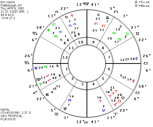 Before we leave Eric, do his local houses in Littleton, CO provide any additional insight into his problems there? His Ascendant there was still in Scorpio, with Juno conjunct it within 2 degrees. This reinforces the importance of peer relationships that was shown in his birthplace chart by Pallas close to the Descendant. The midpoint of his local A/MC was just under 22 Virgo, becoming part of the massive aspect network of P Sun and Mercury, P Hela, Libitina, the lunar nodes, etc. His local Part of Death in 3 Libra was on Jupiter, square Nobel and the Moon. P Neptune held a trioctile to his local MC. P Ascendant opposed P Chiron and was octile his local Part of Death and P Jupiter. His local P Part of Death was trioctile the local Ascendant and his local P East Point was quincunx P Mars and the Moon to form a yod, while his local P Antivertex was octile P Moon. The local angles certainly reinforced the destructive potentials in the birthplace chart.